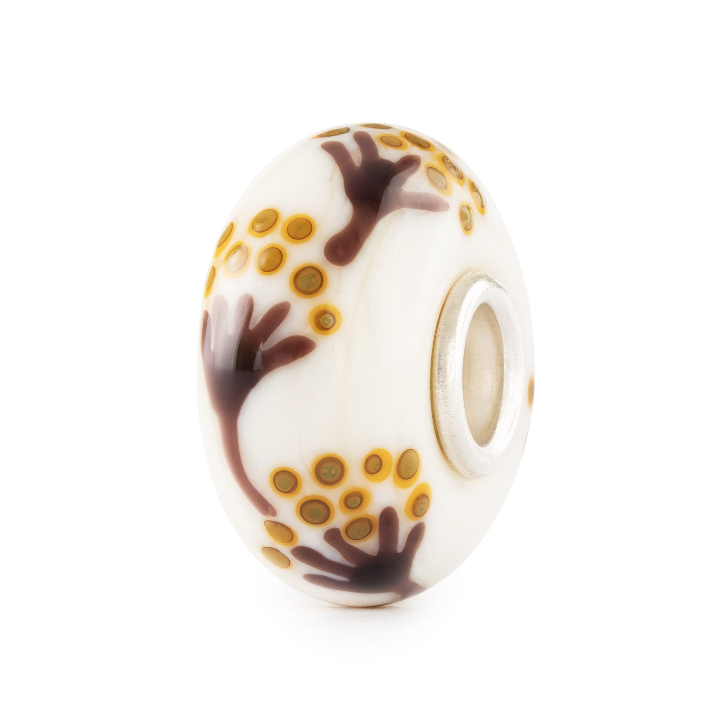 This glass bead has a classic shape and smooth surface. It is crafted in brown and yellow glass in the shape of flowers or leaves on a white background - it's up to you! The bead has a clean and simple look, yet at the same time, being incredibly detailed. A sterling silver core adds a refined finish, making it as enduring as it is radiant.