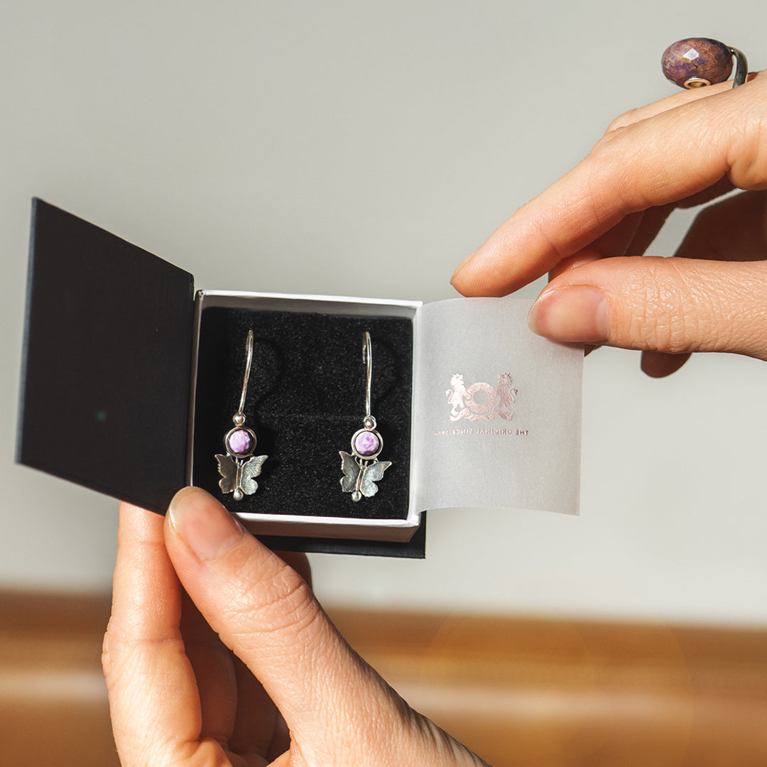 Detailed butterflies surround soft Purple Jade, adding a touch of gentle movement and warmth. The combination of silver and gemstone reflects both strength and sensitivity, a graceful reminder of balance in love.