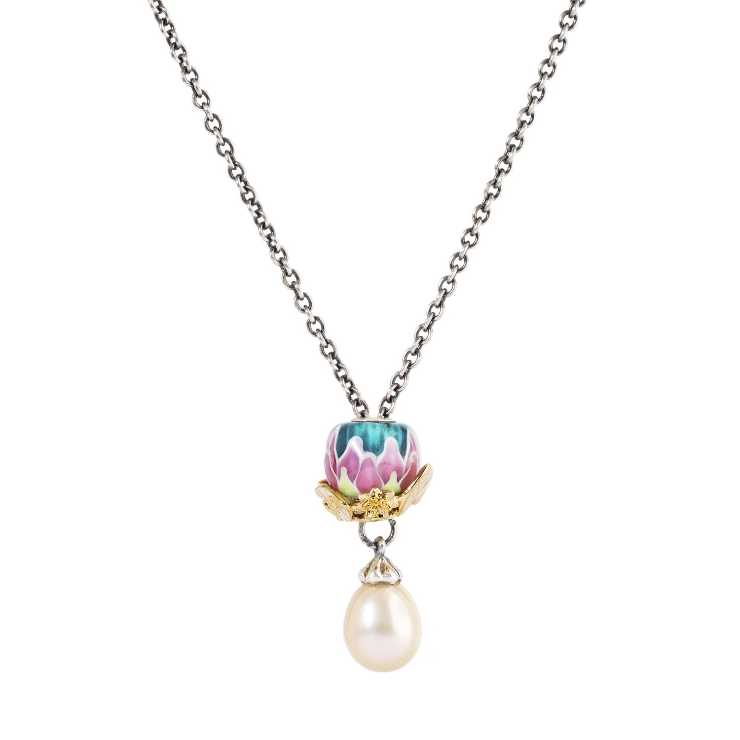 This stunning Sterling Silver bead is designed to elegantly cradle your favorite bead. Four water lily leaves are gracefully arranged next to a water lily flower. The Water Lily Cradle is particularly striking when placed at the bottom of a Fantasy necklace, supporting and embracing your favorite beads.